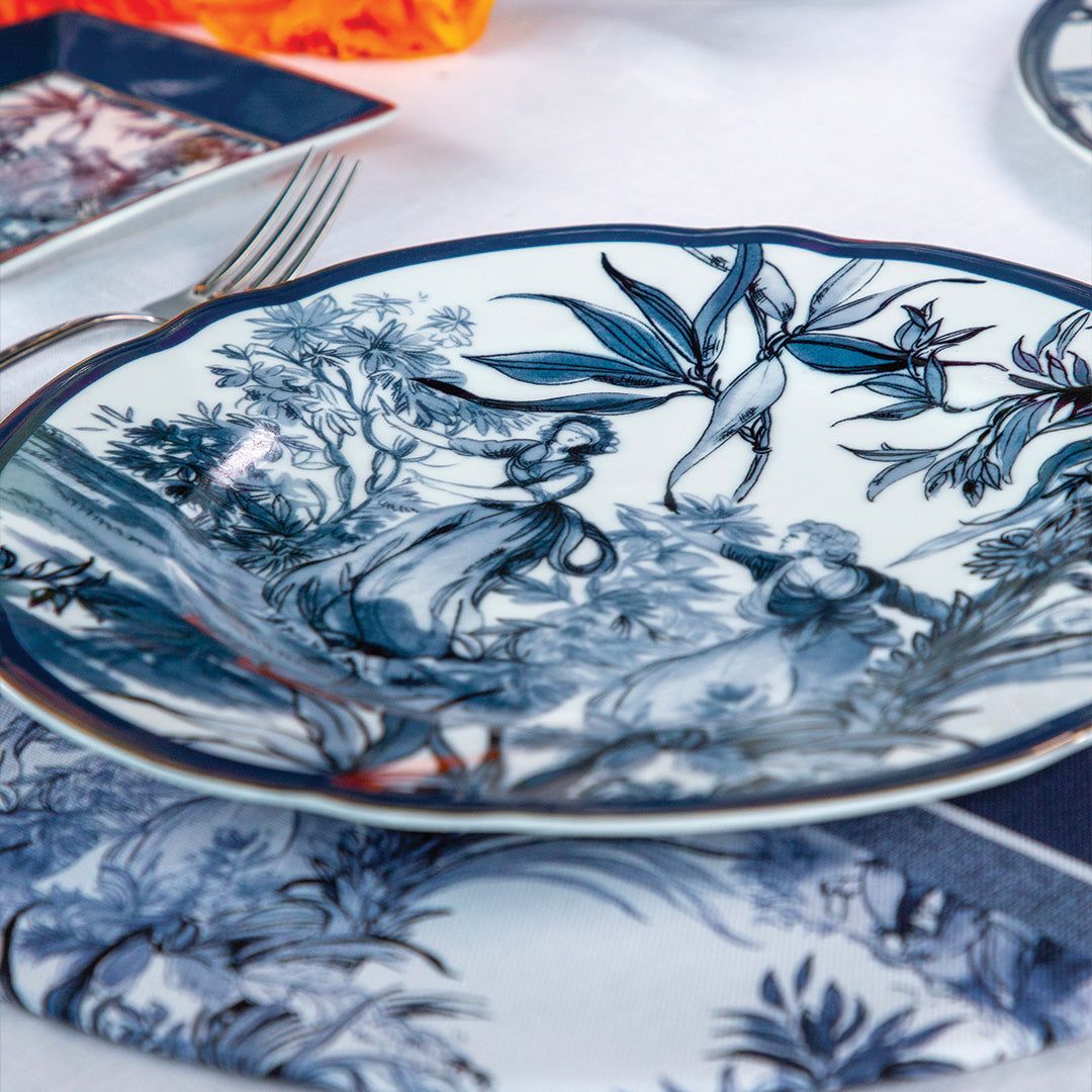 Set of 6 porcelain dinner plates from the elegant Versailles collection. The classic toile de jouy design of the Versailles collection evokes a world of joy, romance and adventure.
